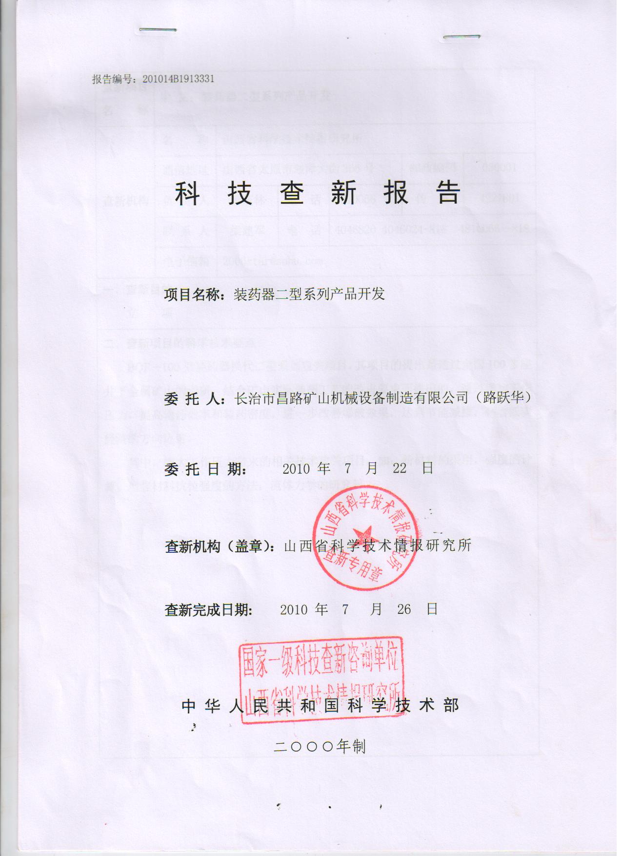 裝藥器二型開發(fā)科技查詢報(bào)告 國(guó)家一級(jí)科技單位
